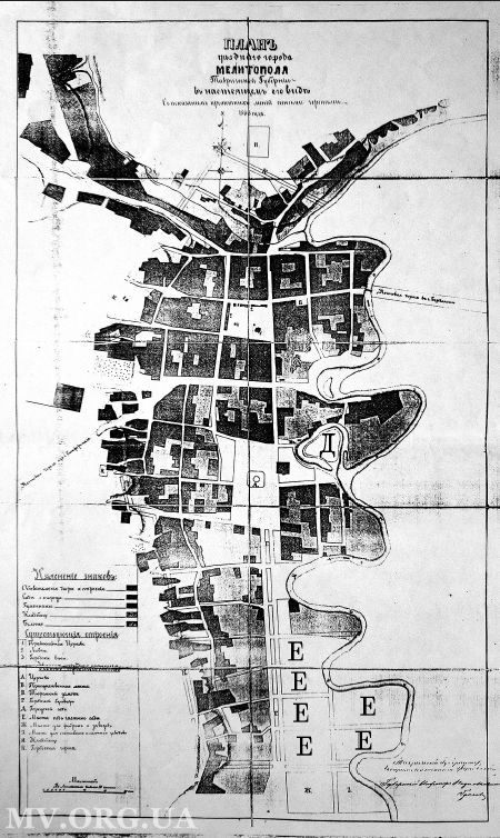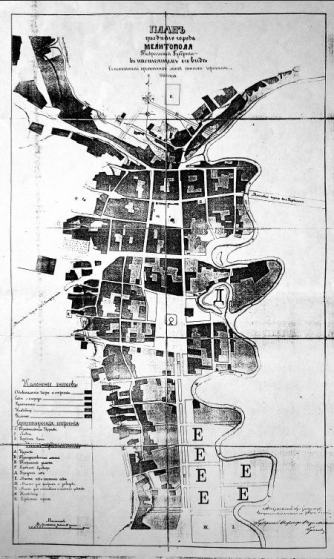 В XIX - начале XX вв. Мелитополь занимал площадь 1390 га. Центр города находился в низменной местности, с запада и севера его окружали склоны возвышенности, а с востока - правый берег Молочной. Растущий город поднимался по склонам и, стоя где-нибудь на окраине, можно было видеть весь город сразу. И если дело происходило летом, то значительную часть города и окрестностей составлял зеленый фон многочисленных садов.