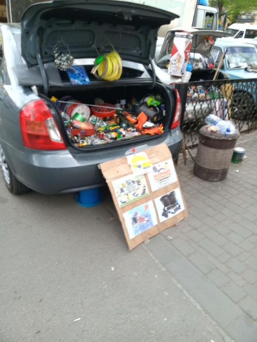 Торгующие стоят на машинах с открытыми багажниками, где выложен товар. Или просто в руках держат таблички с надписями "джинсы", "футболки мужские" и прочее.