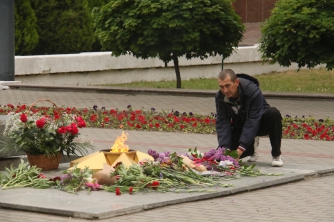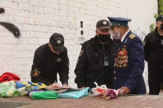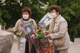 На Братском кладбище все также обошлось скромным возложением цветов без долгих речей и развертывания огромных флагов. Правда, предводителю "левых" Тарасу Генову пытались поменять маску на одноразовую - его оказалась слишком красной.