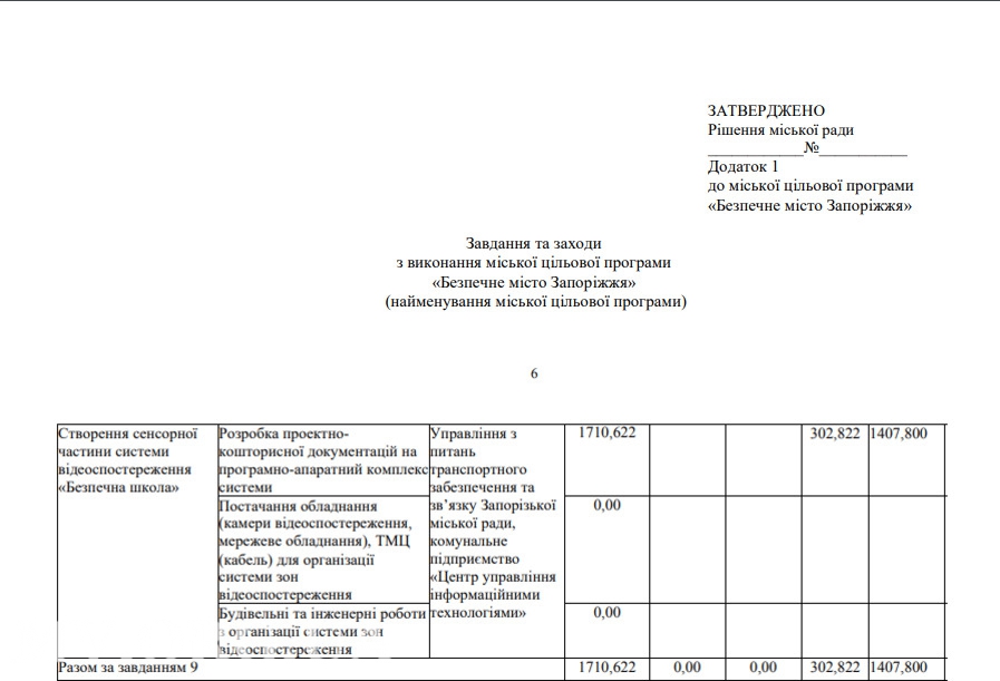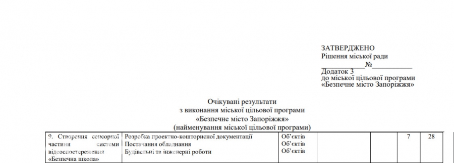 В этом году планируется выделить уже свыше 1,4 млн гривен на проектные работы для установки камер видеонаблюдения в 28 запорожских школах. По сравнению с сентябрём прошлого года, каждая из 28 проектов подорожал на 7 000 гривен. Соответствующий проект решения горсовета о внесении изменений в решение городского совета от 21.12.2016 №30 «Об утверждении городской целевой программы« Безопасный город Запорожье »(с изменениями) был опубликован на сайте мэрии Запорожья.