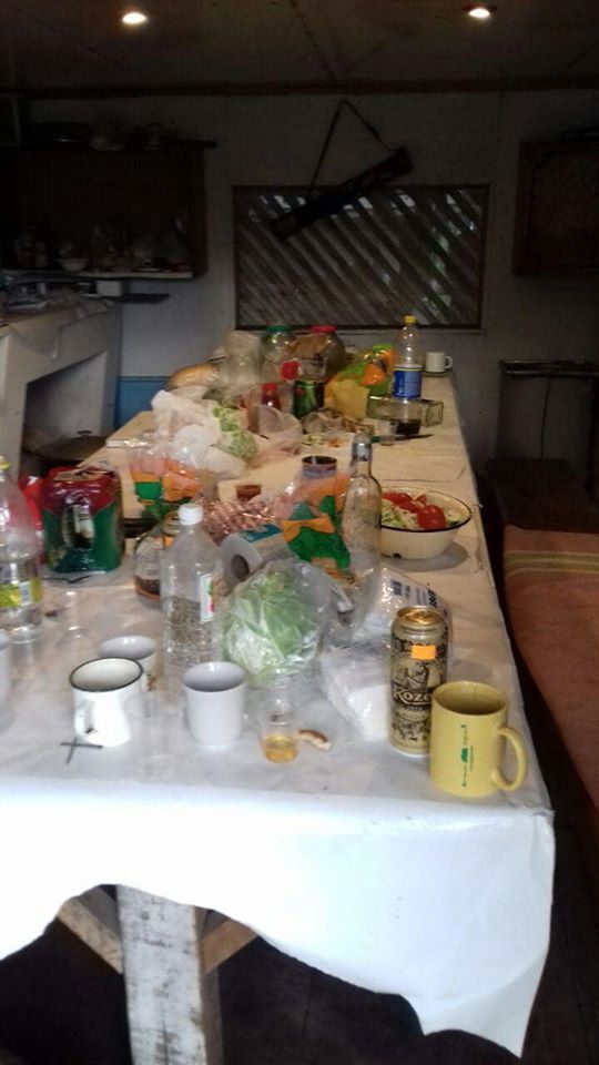 На фотографиях видно накрытый стол в охотничьем домике с множеством спиртных напитков, а также столик у пруда с мангалом.