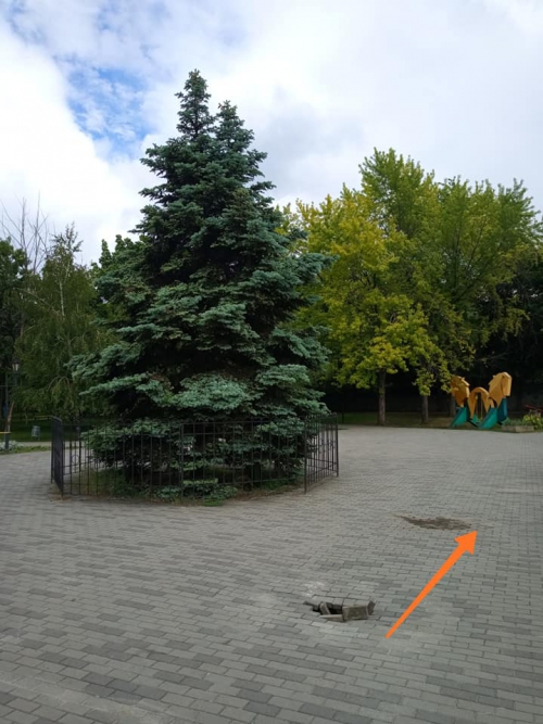 Кусок плитки провалился неподалеку елки. На фото видно, что еще один кусок покрытия скоро также провалится.