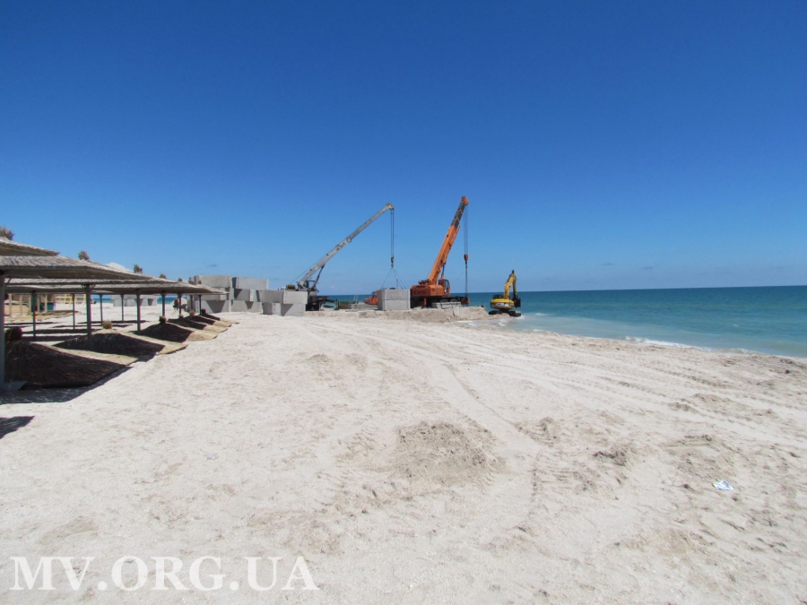 На центральном пляже Кирилловки идет стройка. Несколько экскаваторов и кран укладывают в море бетонные плиты.
