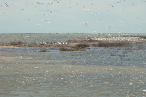 Найдены еще две гнездовые колонии - на небольшом, отделенном от суши острове и на размытой узкой части самой косы, также превратившейся в небольшой остров. Всего здесь загнездилось около 4000 пар, все они сейчас находятся на стадии насиживания яиц. Из-за небольшой площади таких островов плотность гнездования очень высока, поэтому очень важно не пускать сюда людей.