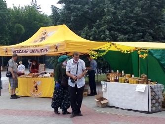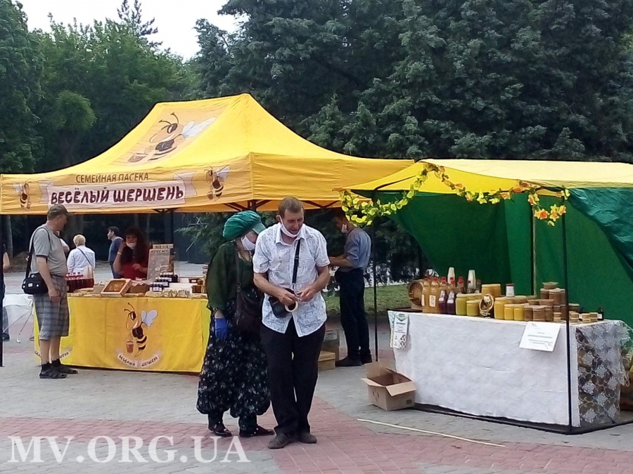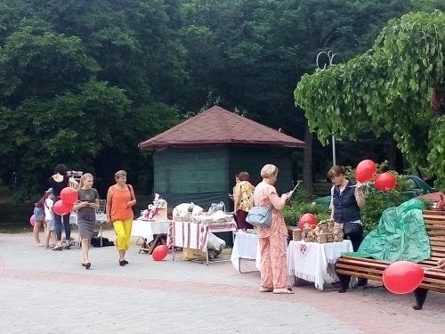 На аллее у фонтана уже расположились торговые точки. Продают продукты и хенд-мейд. Конечно, людей пока немного.