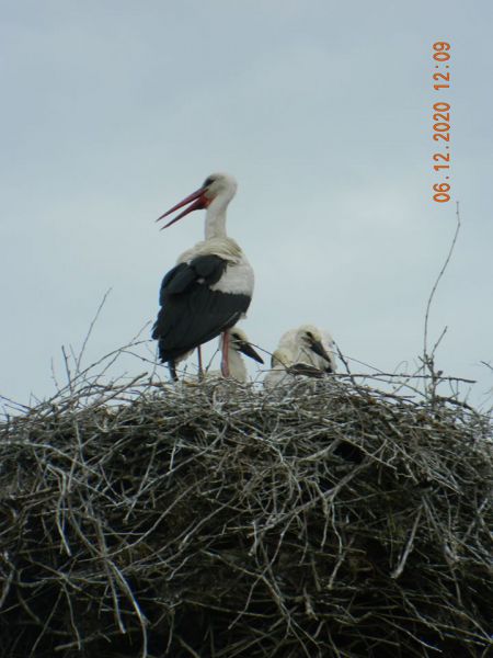 В гнезде аиста белого в селе Тимофеевка - трое птенцов.