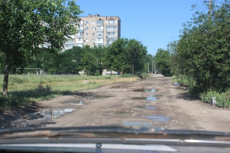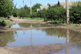 Сразу на повороте на Юрьевскую с ул. Строительной начинаются огромные ямы, после дождя превращающиеся в озера. Чуть дальше ямы становятся меньше – местные жители сами как могли засыпали их строительным мусором.