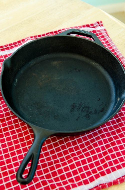 Поместить посуду кверху дном на час в духовку. Снизу необходимо поставить противень, куда будут капать остатки жира. Подождите еще примерно столько же, пока сковорода остынет и вытяните ее из духовки.