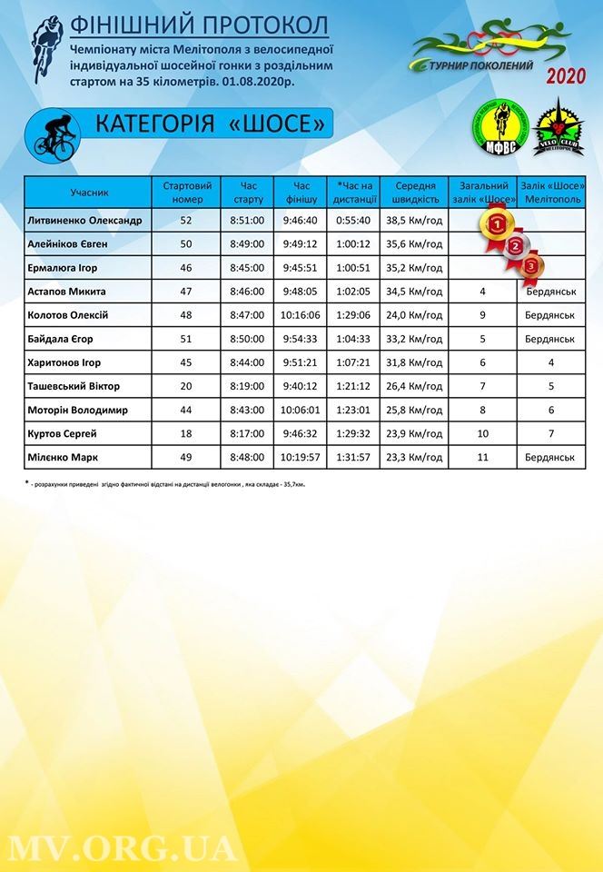 Самыми быстрыми велосипедистами в категории «Шоссе» стали Игорь Ермалюга, Евгений Олейников и Александр Литвиненко.