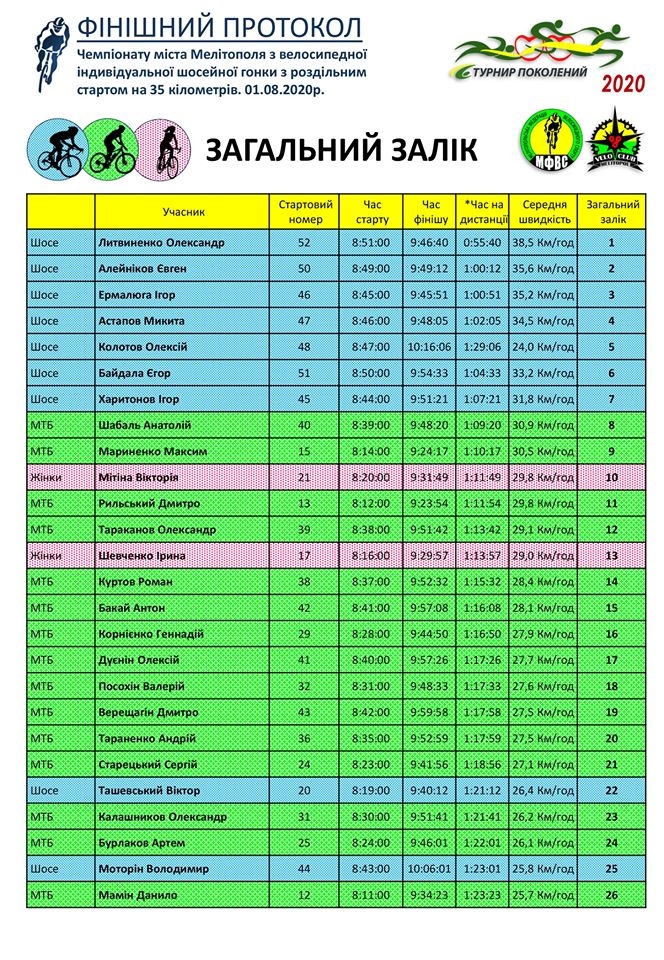 В командном зачете по триатлону третье место заняла команда «Рвем реальность» (Артем Макаренко, Сергей Минкин, Денис Воронцов), второе место - команда «СКБ-Мелитополь» (Алексей Головачев, Вадим Передерий, Даниил Василенко), Первое место и титул чемпиона 20-го «Турнира поколений» достались команде «Скала» (Иван Амелин, Павел Ветренников, Юрий Семенда).