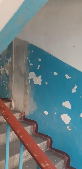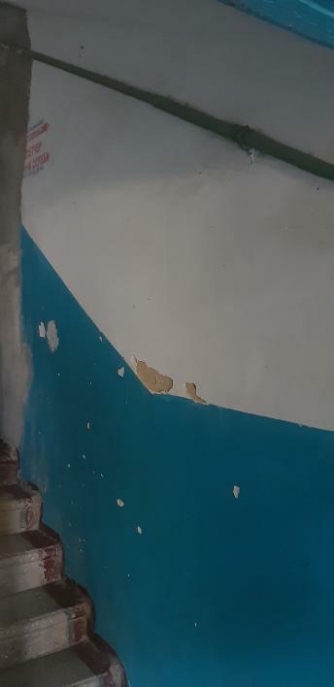 Жильцы 1-го подъезда вышеупомянутого дома не знают, что такое заходить в красивый подъезд. Ведь их за дверью встречают стены, на которых облупилась краска и кусками отпадает штукатурка, грязные разводы на побелке и оббитые углы.