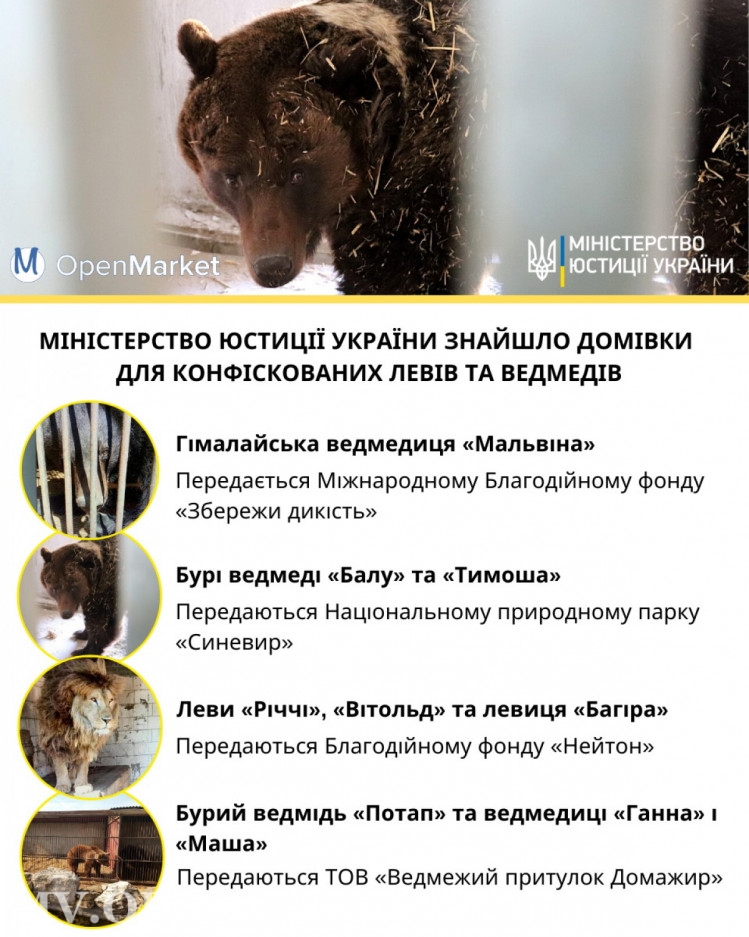 Комиссия в Васильевке определила, кому и каких зверей безвозмездно передать. Итак, гималайского медведя по кличке Мальвина передают благотворительной организации "Международный Благотворительный фонд "Сохрани дикость"; бурых медведей Балу и Тимошу – Национальному природному парку "Синевир"; львов Риччи, Витольда и Багиру – благотворительному фонду "Нейтон"; бурых медведей Потапа, Анну и Машу – ООО "Медвежий приют-Домажир".