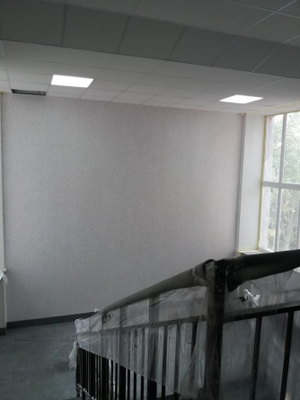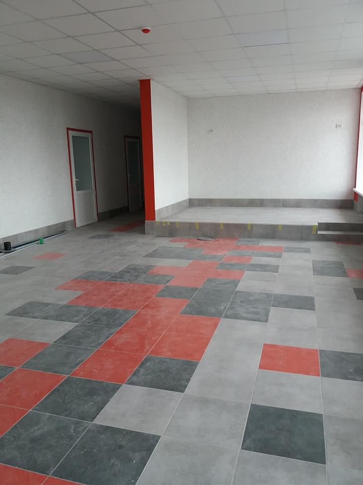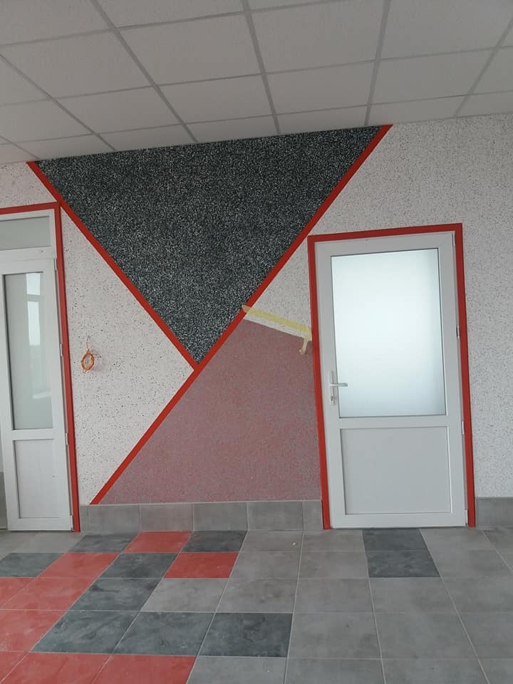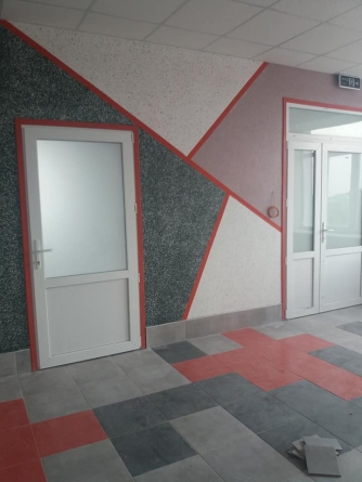 Судя по очередным фото, ремонт помещений учебного заведения практически завершен. Внутри школа выполнена в серо-черно-красных тонах, почти как и снаружи. В школе уже сделаны стены, потолки, полы, крыша, пищеблок, установлена мебель.