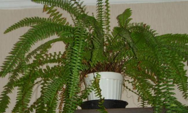 * Бостонский папоротник. Он неприхотлив и нуждается только в регулярном поливе и орошении листьев. В остальном же не требует особого внимания, зато хорошо испаряет влагу из своих листьев.