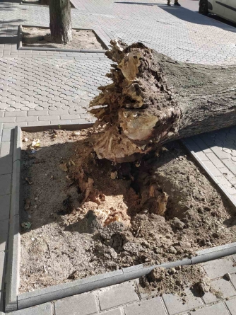 ЧП произошло на проспекте Б. Хмельницкого в районе библиотеки им. Лермонтова. Дерево было настолько изъеденным вредителями и гнилым, что даже в отсутствие ветра, которым "славится" Мелитополь, рухнуло.