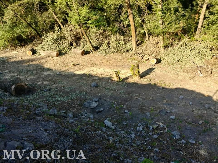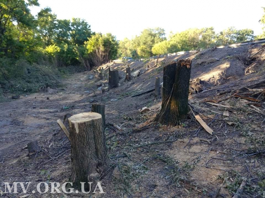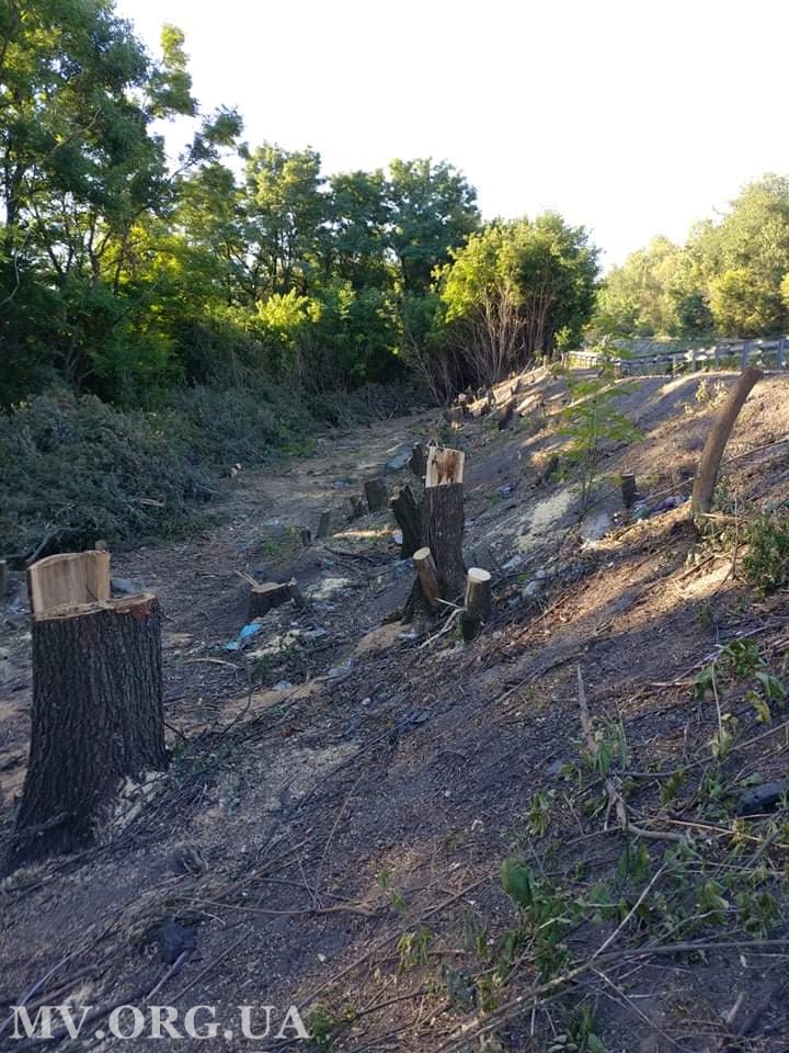 В яме на первом спуске от развилки на Космосе массово вырубили здоровые деревья.