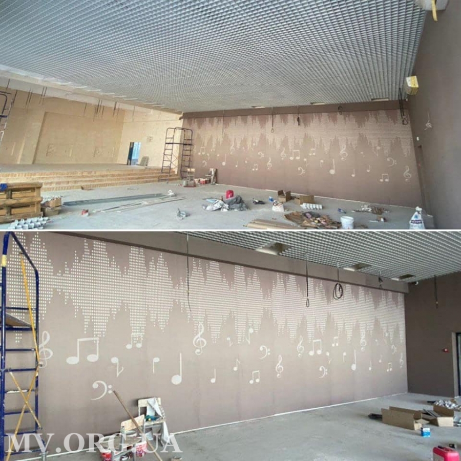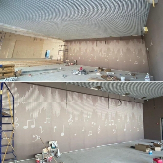 Школу сделали не только яркой, но и более чем тематической. Стойка рецепшн будет выполнена в виде пианино, клавиши этого инструмента будут прослеживаться в ступенях, на стенах одного из залов нарисуют ноты. Не станет исключением и двор. С высоты уже видно, что плиточку кладут в виде все тех же клавиш пианино.