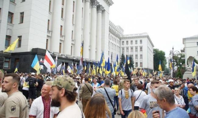 "Сегодня, в День Независимости, мы прошли многотысячным маршем по центру столицы. А сейчас под Офисом Президента, потому что здесь работают люди, которые прямо угрожают украинской независимости и безопасности. Мы требуем зарегистрировать законопроект о защите украинского государства от действия коллаборационистов. Этот документ уже написан. Действия коллаборационистов сегодня является одной из самых больших угроз для Украины - те, кто работают на врага, должны ответить перед законом ", - заявил ветеран полка "Азов" Максим Жорин.