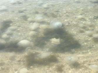 Читательница поделилась с нами фото, на которых вода кишит медузами. Животные собираются в группы, некоторых выбрасывает на берег.