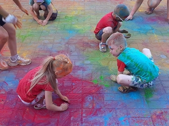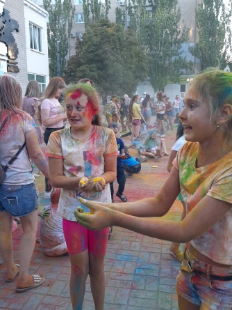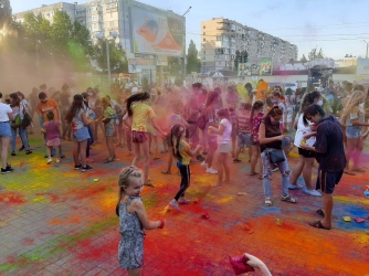 Сначала детей ждала развлекательная программа. И только потом присутствующим раздали краски. Обратный отсчёт, залп, и площадь вмиг окрасилась в цвета радуги.