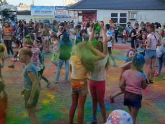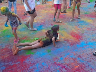 Под музыкальное сопровождение dj Shmidt дети и взрослые принялись раскидываться красками, осыпая не только друг друга, но и себя. А когда краска в руках закончилась, в ход пошло то, что осталось на земле. Некоторые предпочли просто поваляться на плитке - все, лишь бы стать еще ярче.
