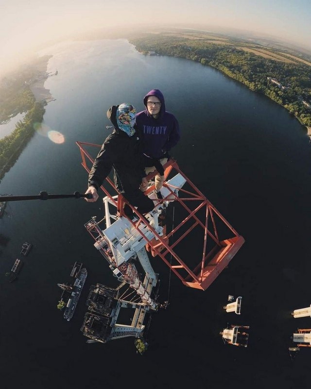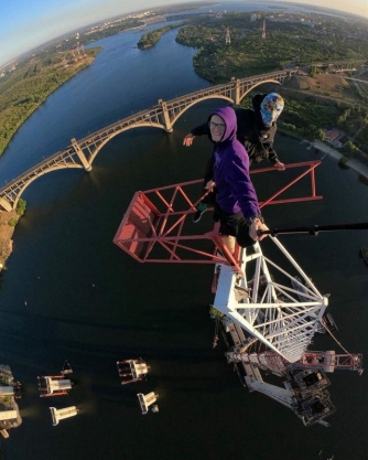 Киевские экстремалы посетили Запорожье и залезли на самую вершину крана на недостроенных мостах, где сняли фото и видео.