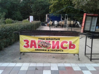 В самом центре парка стоит мангал, на котором красуется запоминающаяся, но не совсем цензурная надпись. Вывеска дает явно понять, что шашлык, который здесь будут продавать, ну уж очень вкусный. Жаль только, что для выражения восхищения своим продуктом у предпринимателя не нашлось приличных слов.