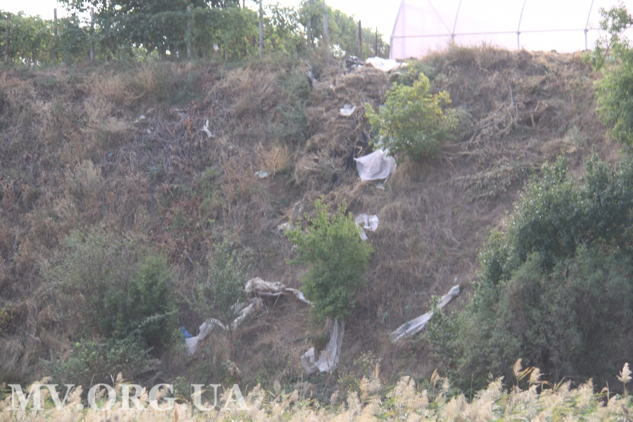 Сами теплицы, естественно, никому не мешают, а вот мусор, связанный с ними, глаз не радует. В двух местах склон усеян использованной полиэтиленовой пленкой и хозотходами. Они "стекают" прямо в реку, образуя каньоны из пластка.
