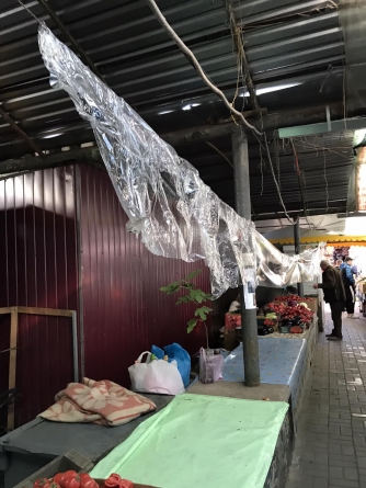 Еще весной торговцы и администрация рынков города проявили изобретательность и в качестве защитных экранов использовали пищевую пленку, которой ограждали свои батискафы. Защита очень условная, но имелась. Летом эта норма забылась, сейчас же, когда город был отнесен в «орнажевую» зону и вопрос о закрытии рынков снова повис в воздухе, торговцы вспомнили о защитных экранах. Правда, на этот раз они еще более бесполезные. Например, над некоторыми торговыми местами отрезы полиэтилена просто развеваются, словно выстиранное белье на сушке. У других «экран» ограждает лишь пятую часть торгового места.