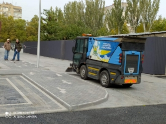 Сейчас около бассейна ведутся последние приготовления - сотрудники коммунальных служб кладут плитку, а спецтехника подметает тротуары.