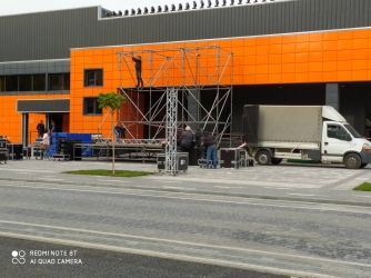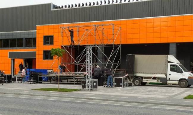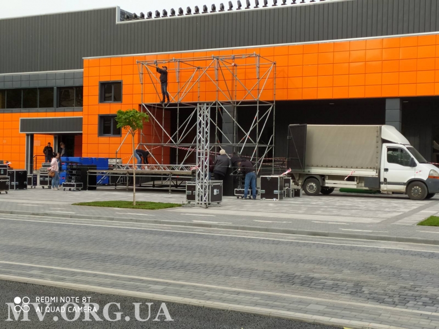 На площадке перед водно-спортивным комплексом рабочие собирают сцену и устанавливают аппаратуру для торжественной части, которая начнется в 18:30.