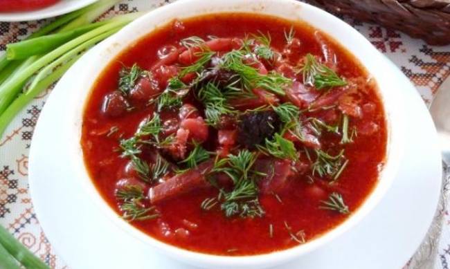 Без мяса, зато с грибами и черносливом. Некоторые не добавляют в такой борщ и картофель, но это дело вкуса. Борщ, приготовленный по этому рецепту, получается с насыщенным и запоминающимся ярким вкусом, кисло-сладковатый, густой, сытный.