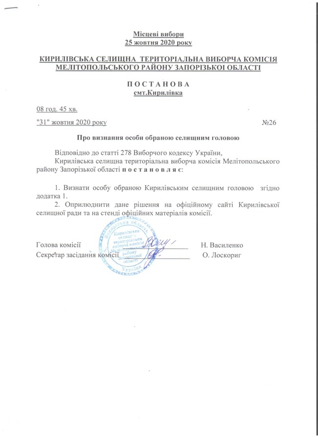 Кирилловская поселковая территориальная избирательная комиссия утвердила протоколы выборов поселкового головы и депутатов поссовета.