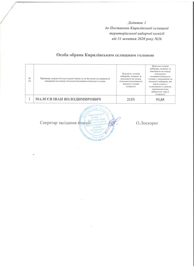 Согласно результатам выборов Кирилловского поселкового головы, победу на выборах одержал действующий поселковый голова Иван Малеев. Его кандидатуру поддержали 2153 человека, что составило 93,85% от всех избирателей, которые участвовали в голосовании, сообщается на сайте Кирилловского поссовета.