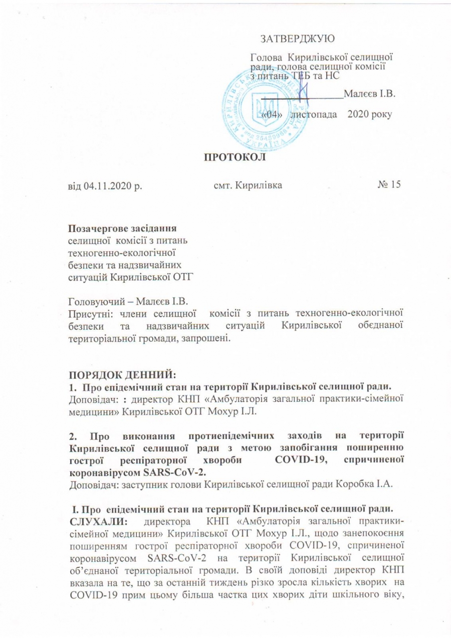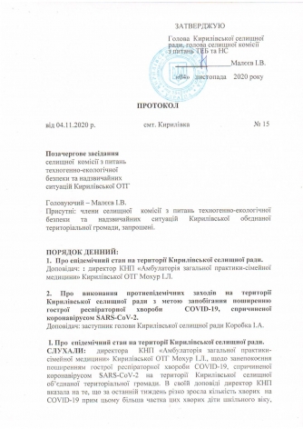 Кирилловская поселковая комисссия по ТЭБ и ЧС закрыла на 2 недели детские сады в громаде, запретила проводить массовые мероприятия с участием более 10 человек, отменила проведение спортивных тренировок и репетиций в заведениях культуры и спорта громады.