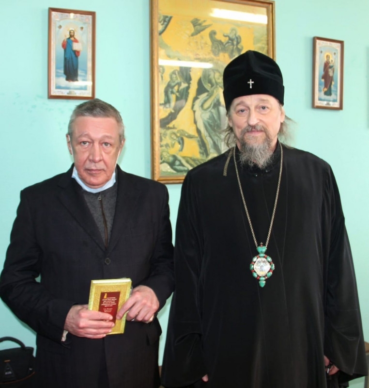 На фотографиях можно увидеть Ефремова с митрополитом Белгородским и Старооскольским Иоанном. Артисту удалось посетить молебен в храме святителя Николая Чудотворца, расположенном в учреждении.