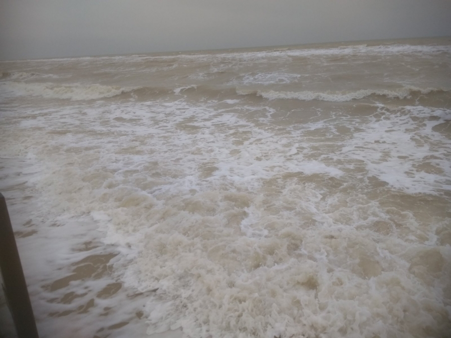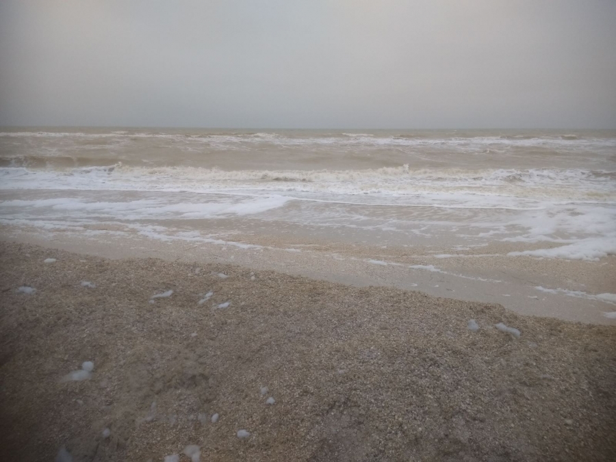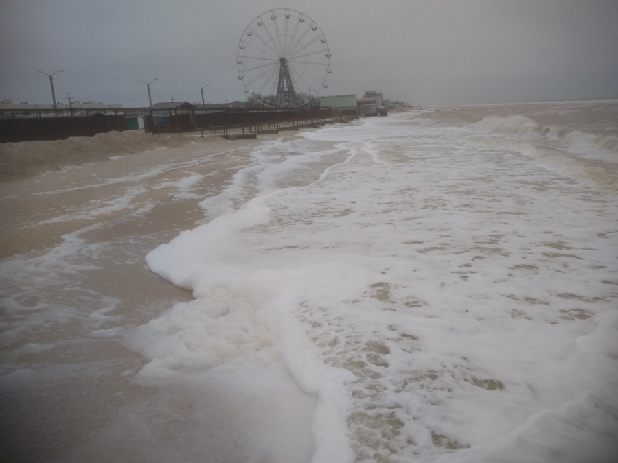 Сегодня в курортной Кирилловке бушует непогода. Сильный ветер поднимает штормовые волны, которые выбрасывают на берег морскую пену.