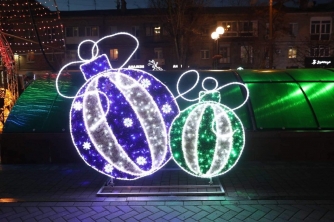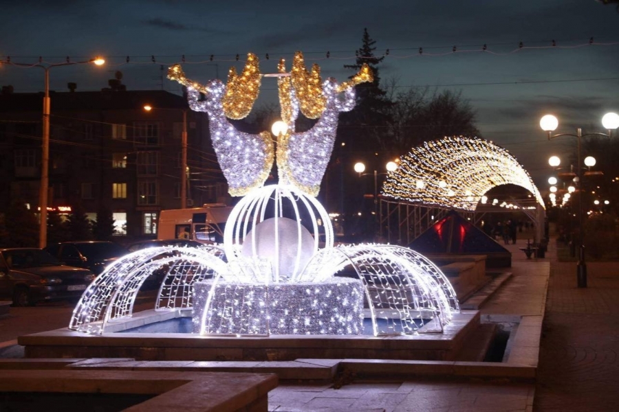 Помимо арок, на Бульваре Шевченко тематические фотозоны с подсветкой: фигуры медведя, елок и цветной фонтан.