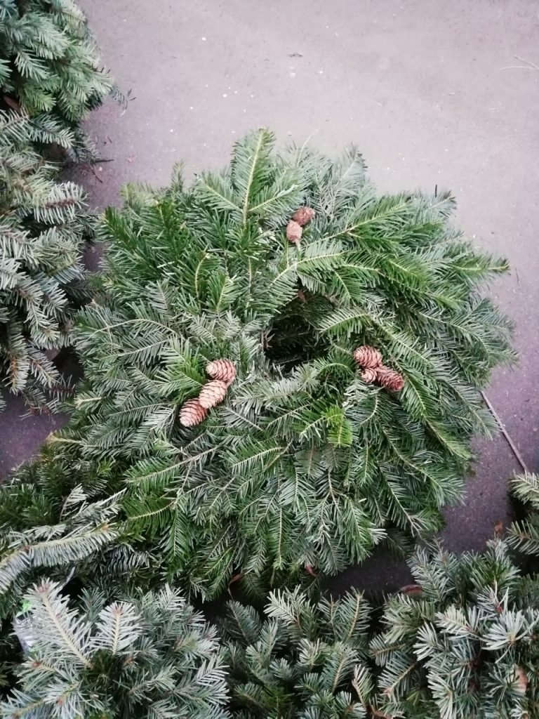 Можно купить ветки пихты с шишками (их, как правило, берут на веночки) от 50 грн или веточки сосны — от 5 грн. Также из веток сосны делают «вязку» — небольшие композиции на деревянной подставке. Стоят они 50 грн.