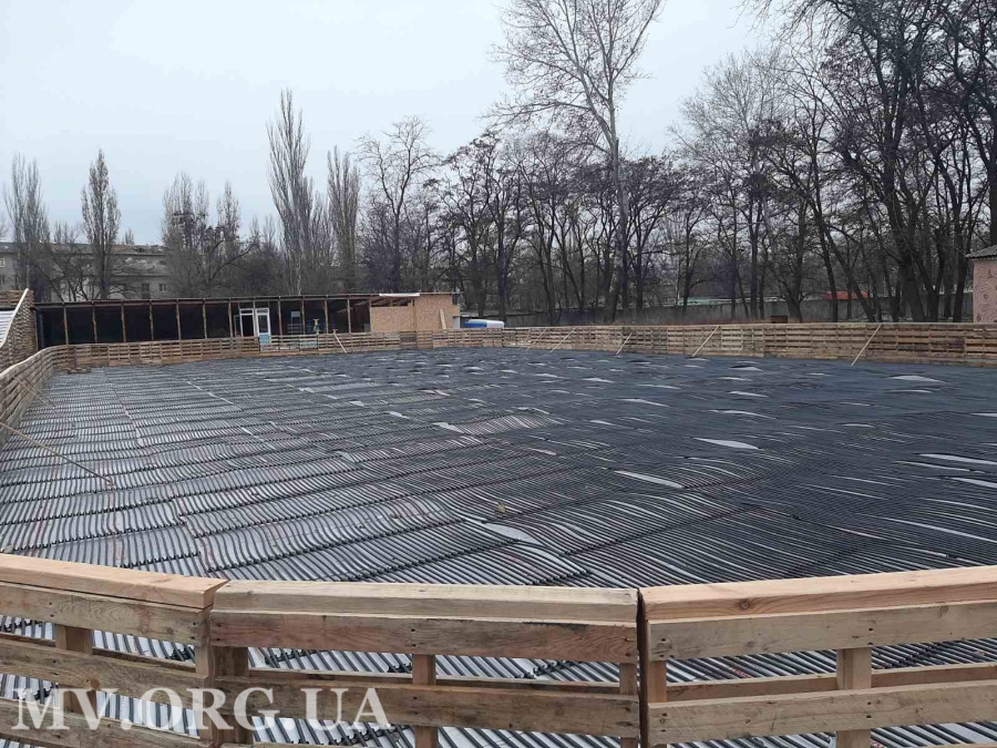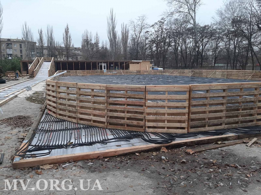 Нам сегодняшний день территория будущего катка уложена трубами для заморозки льда, а с дальней стороны оборудуются раздевалки и подсобные помещения.