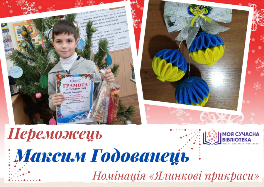 В номинации «Елочные украшения» призовые места заняли Юлия Ященко и Вероника Куриленко (ООШ №7), Полина Воловикова (лицей №9) и Максим Годованец (начальная школа №2), а Гран-при наградили Владимира Ефимова (ООШ №7).