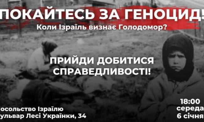 18:00 Анонс акции опубликовали радикалы. "Покайтесь за геноцид! Когда Израиль признает Голодомор? Приди добиваться справедливости!" - гласит афиша националистов.
