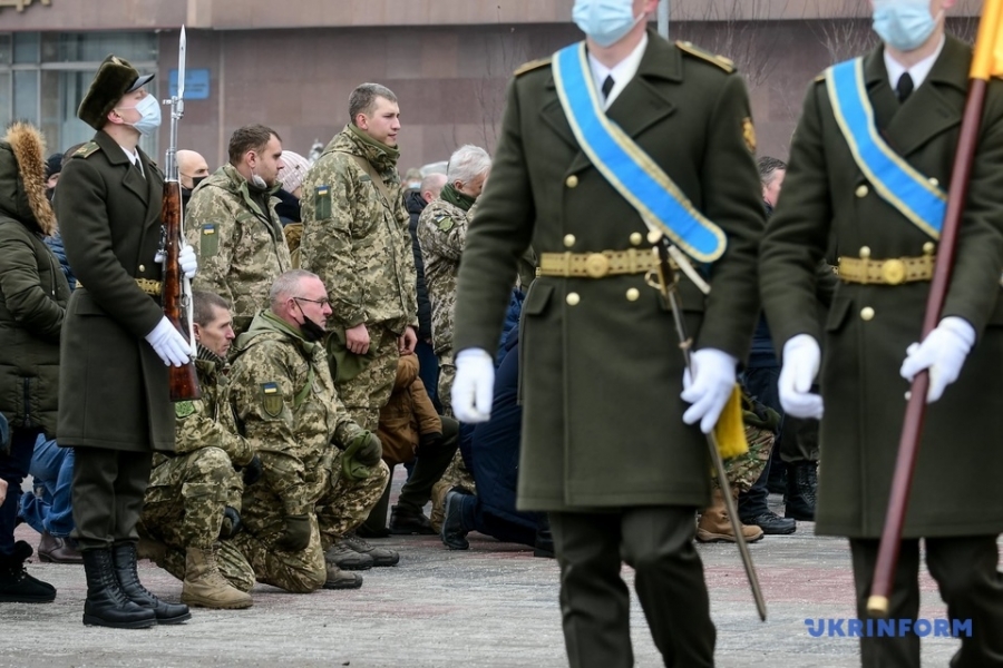 Траурная церемония проходила на Майдане Героев в центре города. Проститься с бойцом пришли сотни людей, передает корреспондент Укринформа.