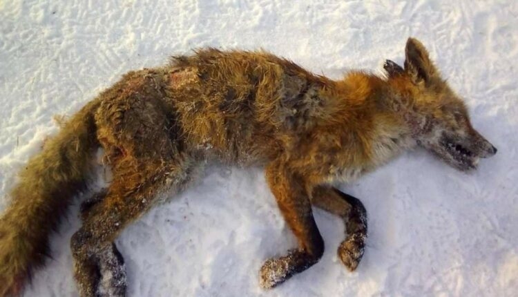 Судя по фото, которые опубликовала жительница Беленького, у лисицы откушен хвост, а сама она была сильно искусана. Кроме того, рядом на снегу остались огромные следы от лап.