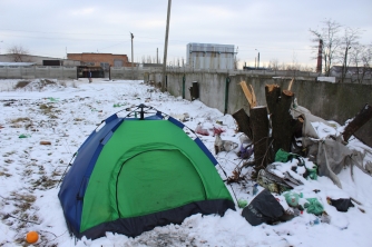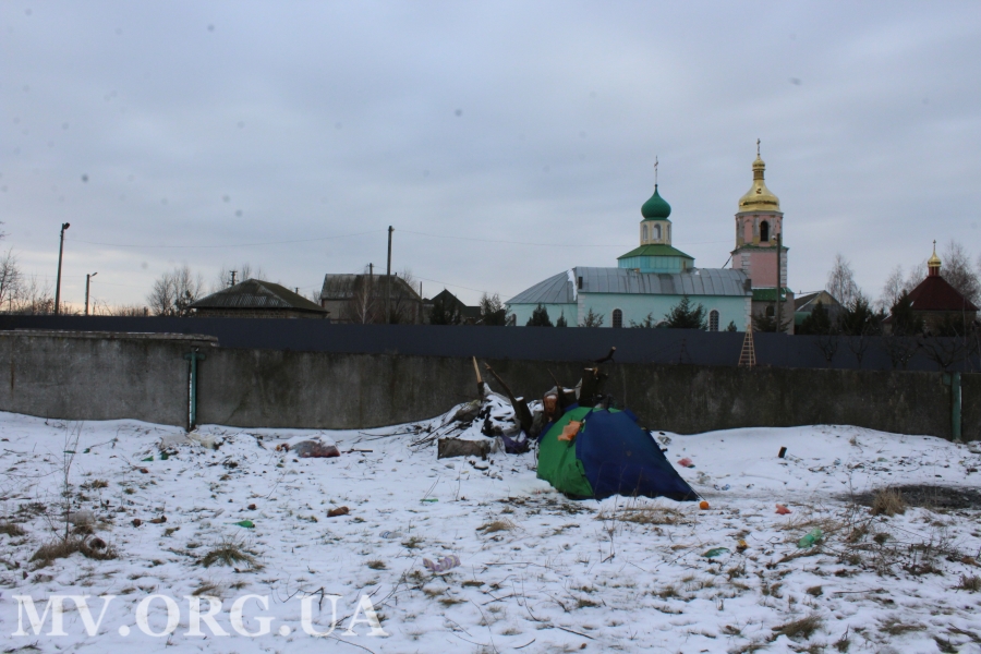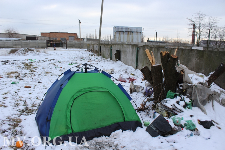 Выезжаем на место за "АТБ" на Новом Мелитополе у забора на заснеженном пустыре и правда приткнулась скромная палатка. Рядом разбросан мусор, пакеты и остатки фруктов.