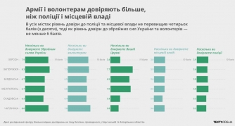 Интересные цифры исследования приведены в диаграммах, обратите внимание на фото. В Мелитополе местной власти доверяют меньше, чем в Запорожье, а вот полиции наоборот, верят больше.