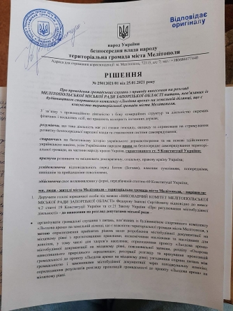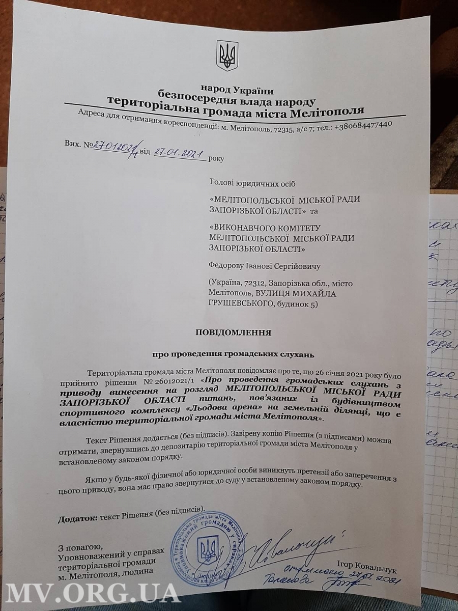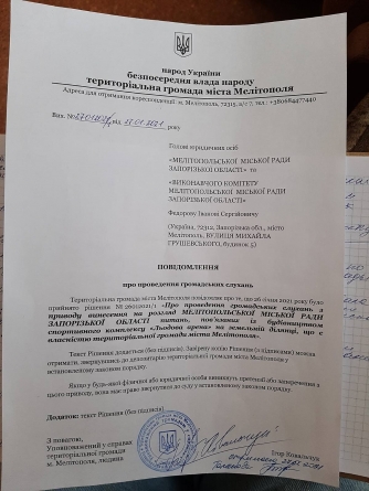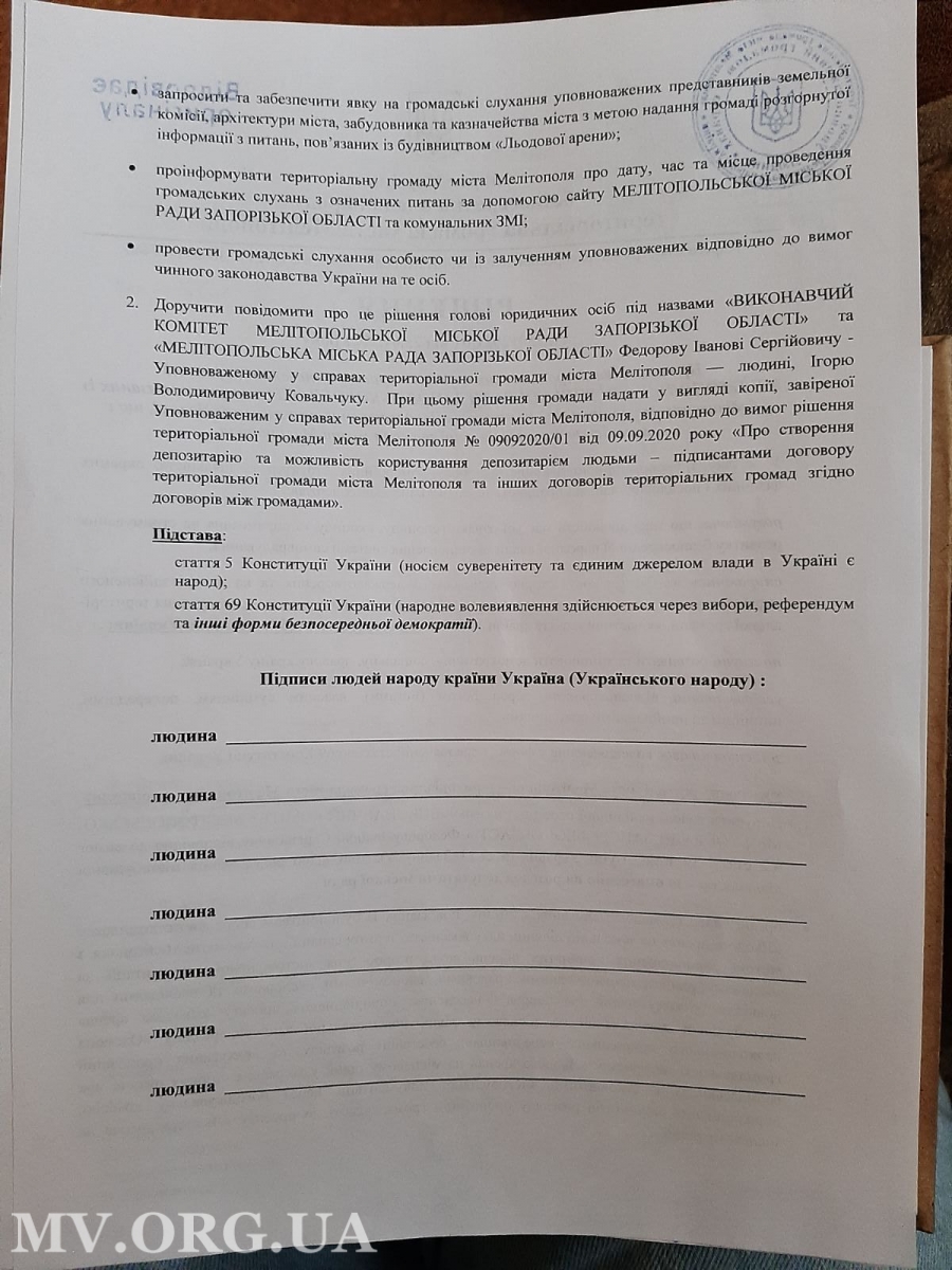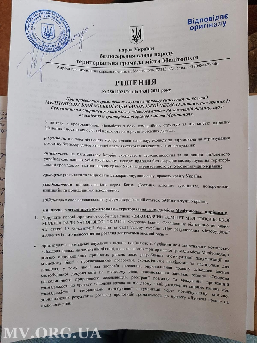 Мелитопольские активисты, относящие себя к "территориальной громаде Мелитополя", приняли решение обязать городского голову Ивана Федорова провести общественные слушания касательно строительства ледовой арены на территории городской больницы №1