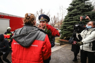 Когда его избранница Ирина эвакуировалась с коллегами на улицу, из-за пожарного автомобиля вышел Владислав с огромным букетом роз и шариками. Пожарный предложил своей любимой пожениться.