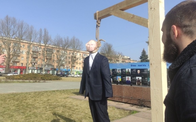В пятницу, 26 февраля, в седьмую годовщину аннексии Крыма Россией, на площади Свободы в Херсоне активисты повесили чучело президента РФ Путина на виселице.
