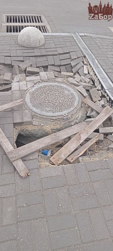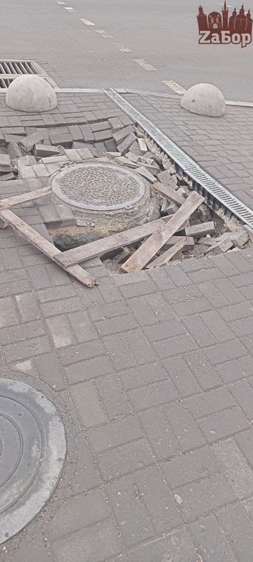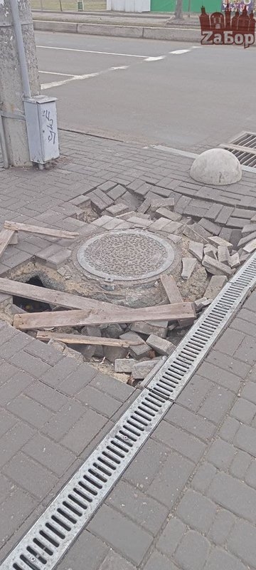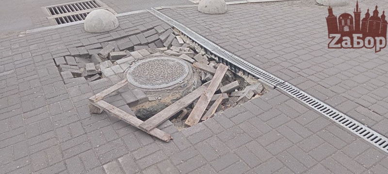 В Вознесеновском районе Запорожья провалилась плитка и люк. Так, в один провал начали кидать мусор, а возле второго разрыли большую яму.
